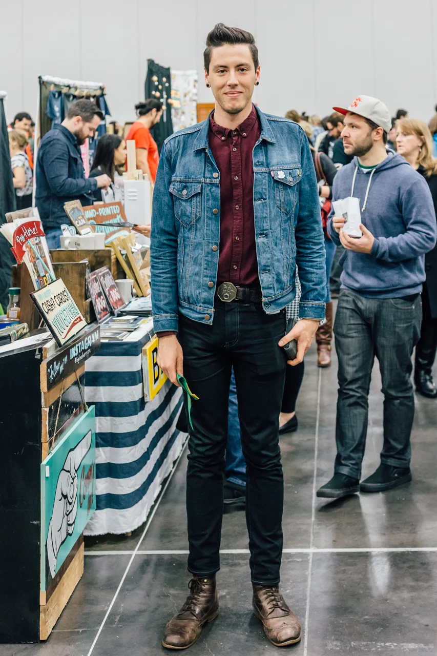 The Portland rocker look - denim, denim, big-ish belt buckle and boots. I bet he's a musician.