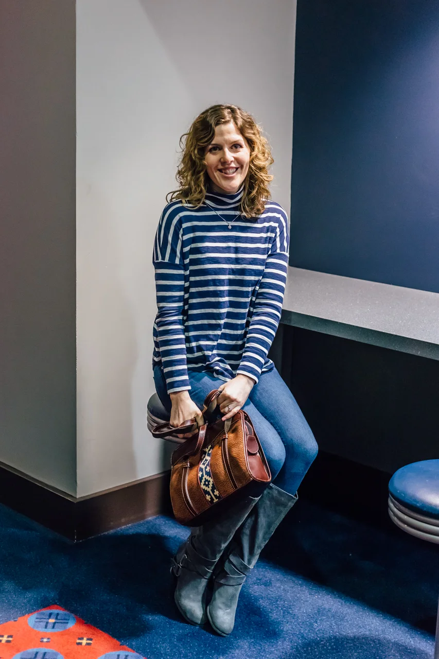 Striped shirt paired with denim and tall boots is always a win. The bag is a bonus.