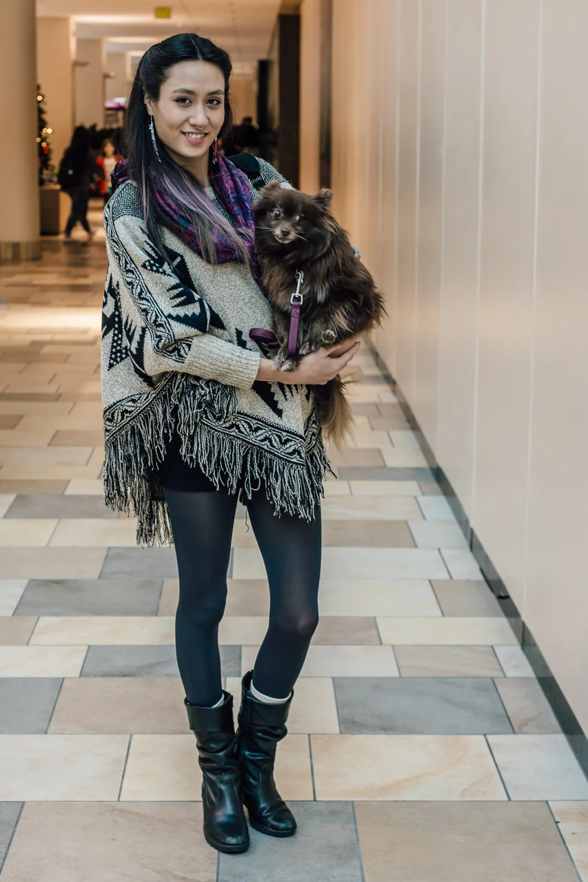 A poncho and a pomeranian. This gal knows how to accessorize with style.